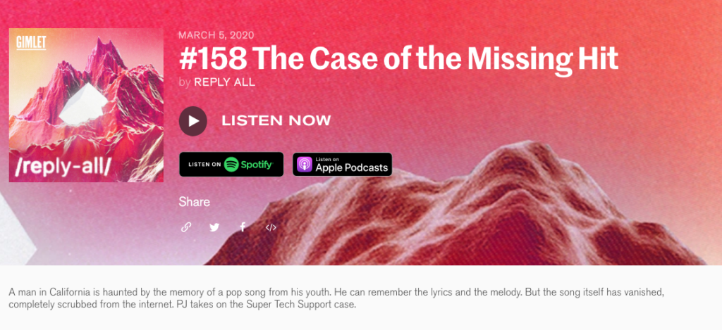 I have mentioned the podcast Reply All on here before, and I’ve bored many a friend about its brilliance. In short, its my favourite podcast, and the latest episode might just be their best ever. It has all the hallmarks of their great storytelling, with a unique perspective on the oddities of life in the age of the internet, and, best of all, it has a proper little mystery at its core. Rarely have I been so swept along in a story, and I wont spoil it for you, but like all good tales, the ending is terrific. Anyway, have a listen, it will bring you joy. And don’t just take it from me, The Guardian reckons it might be the best podcast episode ever. Like, ever, of all podcasts.