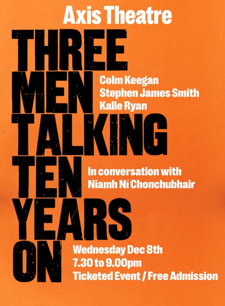 Even though a storm is literally raging outside the window, and a pandemic continues to keep its grip on the country, our show will be going ahead tonight, and we will be adhering strictly to COVID guidelines. The Axis Ballymun staff will be very thoughtful and mindful of everyone’s experience, and it promises to be a truly special night. It is so rare that we get to reflect publicly on a piece of art or creativity a decade later like this, and we can’t wait to do some readings from the show, premiere our new audio production of the play, as well as launch the 10th anniversary limited edition book. It has all the elements for being a rare night. I look forward to seeing many of you there and sharing in this milestone. Most of all I’m looking forward to being onstage with Stephen and Colm again, and having a few laughs as we meander down memory lane. Admission is FREE, but you must book tickets – there are still a handful left here